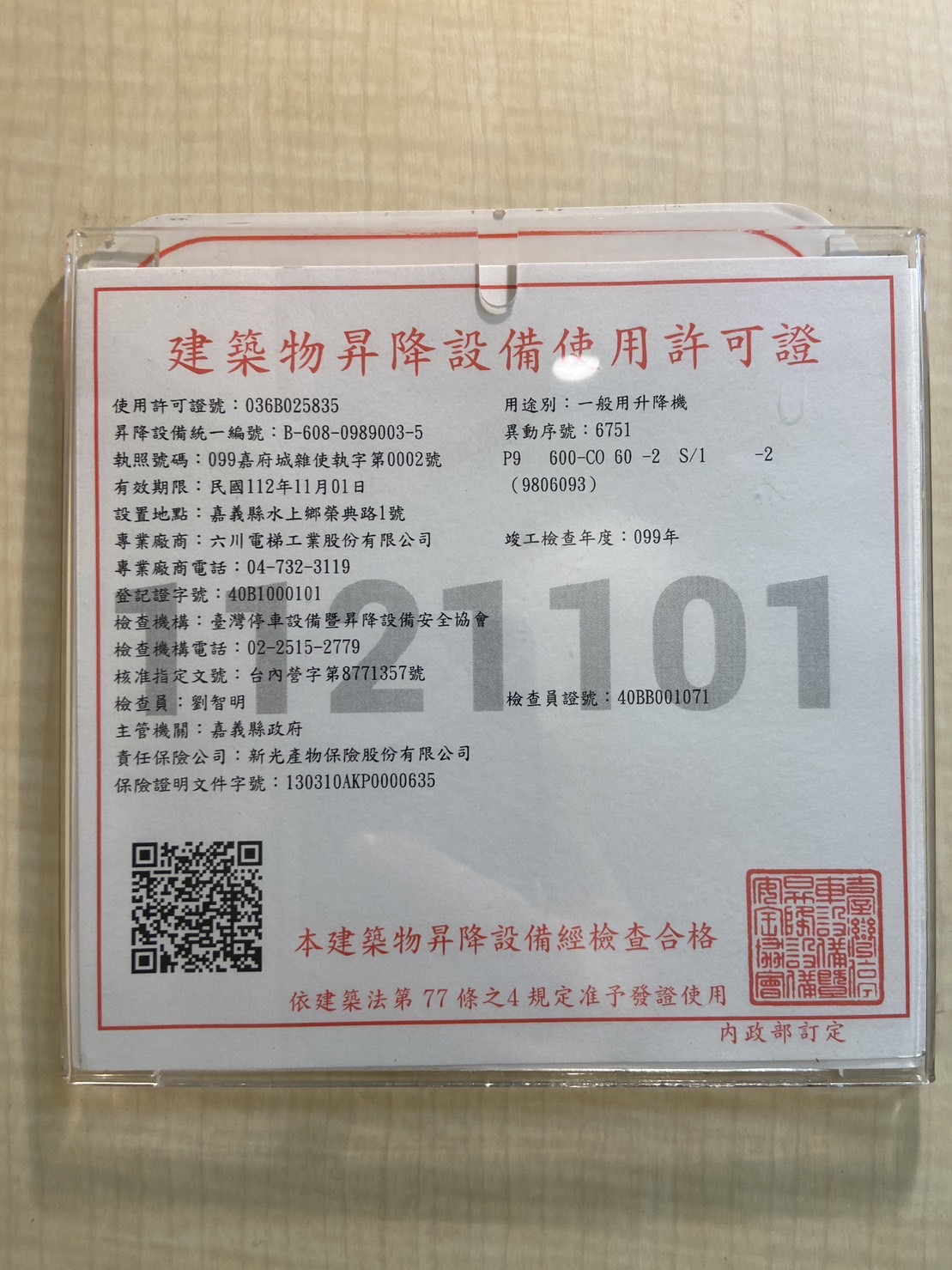 昇降設備安全檢查 嘉義航空站昇降設備之安全檢查依「建築物昇降設備設置及檢查管理」規定,由臺灣停車設備暨昇降設備安全協會核發航廈A電梯使用許可證,昇降設備使用許可證之有效期限為民國112年11月01日。 建築物升降設備使用許可證(JPG)
