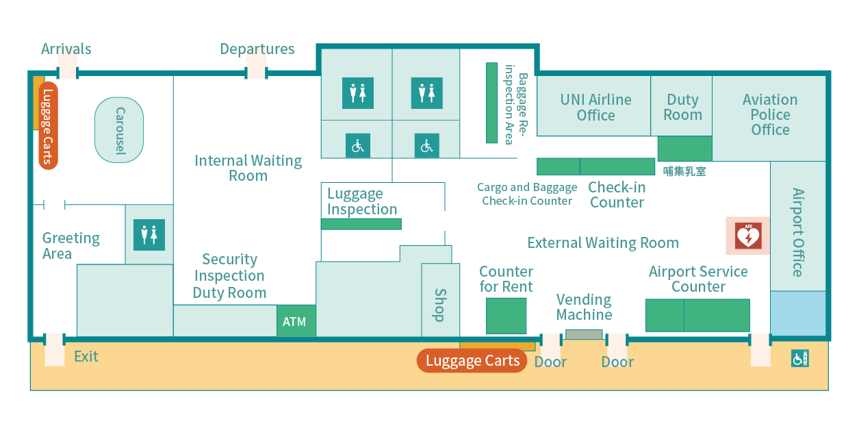 The international waiting area includes passenger waiting area, airport office, airline counters, service counter, retail shops, public telephones, wireless internet area, restrooms, accessible restrooms, and nursing room.